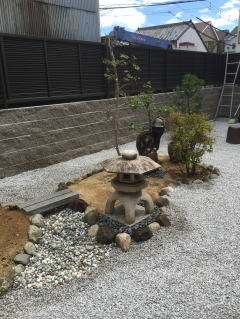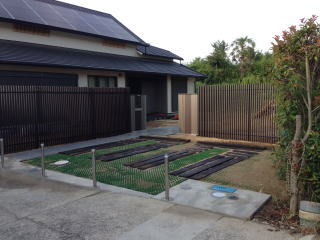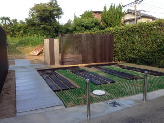御影石アプローチ、外門、フェンス、駐車場、地中式車止め、土間打ち、植栽工事