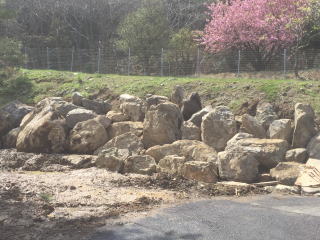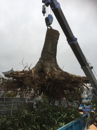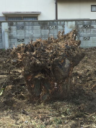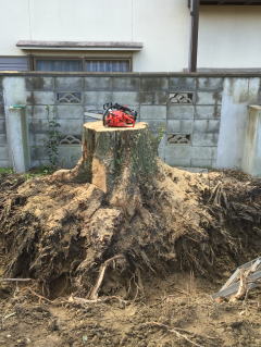 ブロック側の根を根切りチェンソーという特殊なもので切断し大型ユンボで引き倒しました