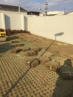 必要な緑地面積をカバーするために10トン車対応の緑化ベースを施設し張芝をおこなった