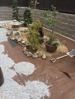 優先順位として除草対策を希望されたのでデュポン社の防草シート+白川砂(御影砕石)2.3トンを施工