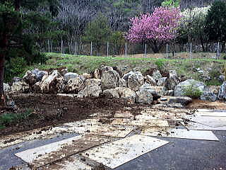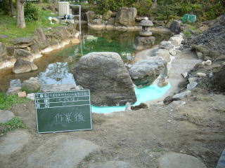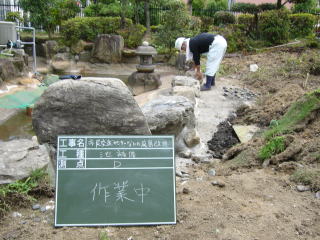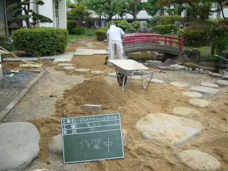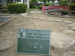 芝生の広場を新設するために既存の池の1/3を埋め立てて張芝施工